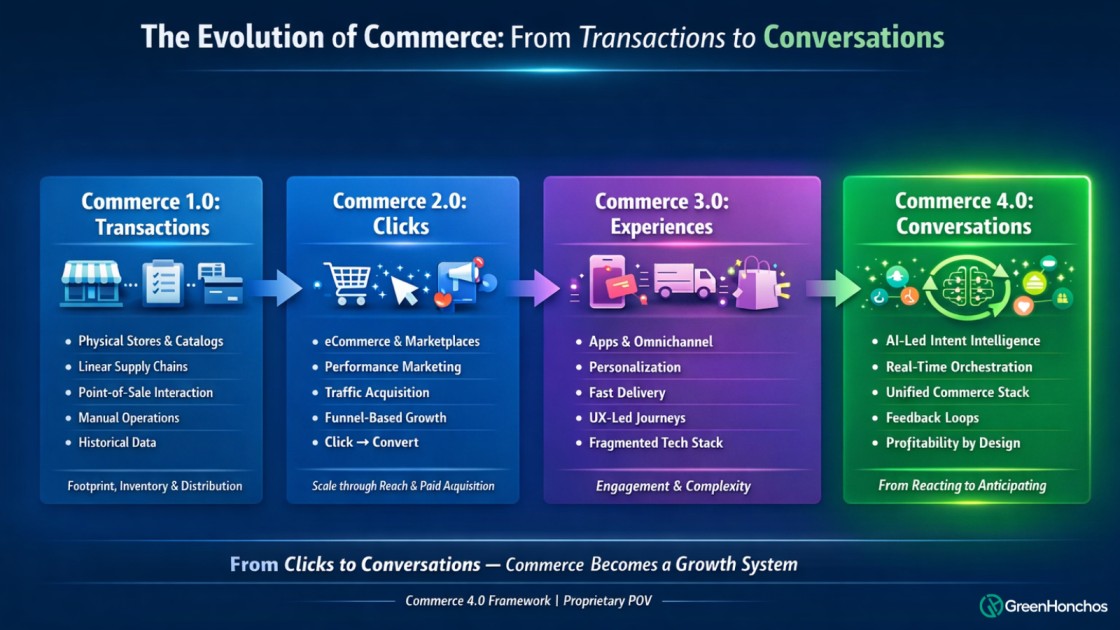 At GreenHonchos (GH), Commerce 4.0 is not a channel strategy or a technology upgrade. It is an operating framework that redefines how brands grow, decide, and compound value in an always-on, AI-enabled world.